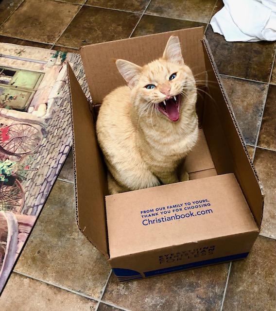 During the day, Tigger would curl up by the window and didn’t find any cardboard box inviting. He did eat but not as much as usual. Once I had the pink antibiotic loaded in the needleless syringe, I had to cup it in my hand and hide it by my leg. Sometimes I could quickly hug him and get most of the dose down as ordered; but sometimes, he would catch a whiff of the medicine as I was approaching, and he would leap off the feeding station. Playing hide and seek for the next few minutes, that is, until I gave up, Tigger strutted like he won the skirmish.